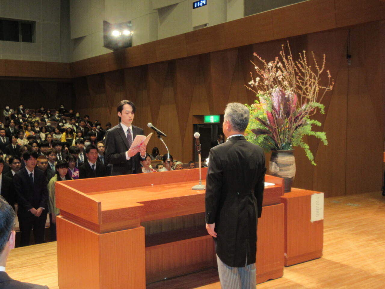 鈴木滋彦学長から「グローバルな視野を持ち、豊かな感性と人間性をもって、今後の人生を歩んでほしい。」と式辞を送られた卒業生代表の押尾優汰君(大学)(写真)が、「本学の理念である『耕土耕心』を胸に刻み、日本の文化や自然、そして自分自身を耕し続けながら、新しい時代を切り開いていく責任を自覚し、それぞれが思い描く未来に向かって懸命に歩んでいく決意です。」と答えました。